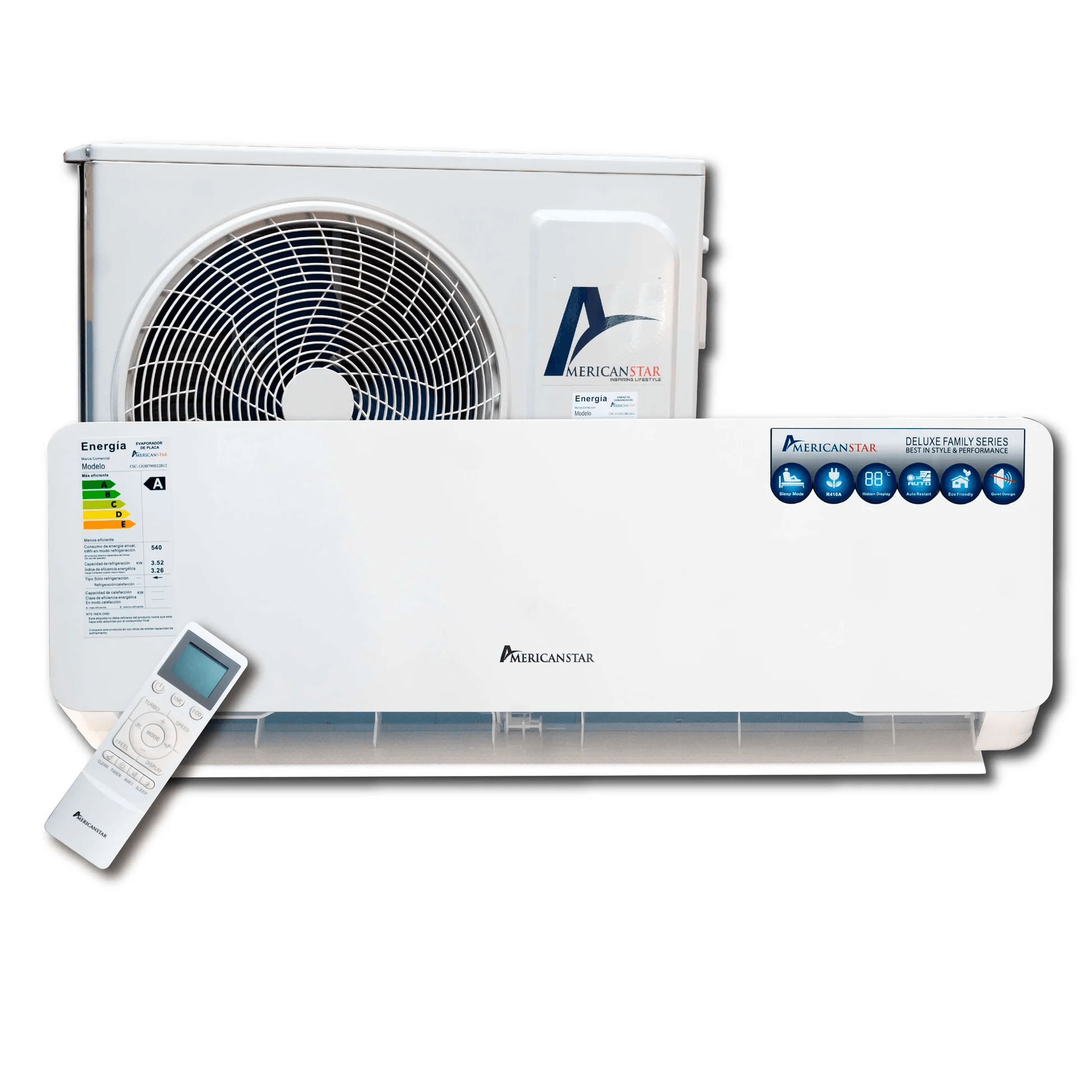 Voltaje 220V/60Hz, Gas refrigerante R410A, Tuber?a acanalada 100% de cobre con tecnolog?a GOLD FIN, Deshumidificaci?n independiente, Modo Sleep y Modo Turbo.